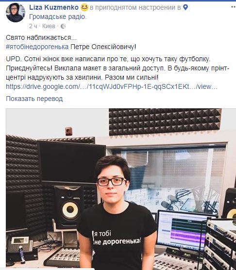 Выложив фото в футболке на своей странице в Facebook, сотрудница Института массовой информации Ирина Земляная написала: "Ровно 3 года назад Петр Порошенко вручал мне награду со словами "Ирина, Украина гордится вами" и я знаю точно, что не потерпела бы, если бы его обращение звучало как "Дорогуша, Украина гордится вами".