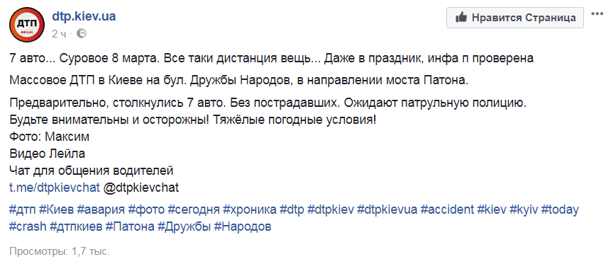 "Массовое ДТП в Киеве на бул. Дружбы Народов, в направлении моста Патона. Предварительно, столкнулись 7 авто. Без пострадавших", – говорится в сообщении.