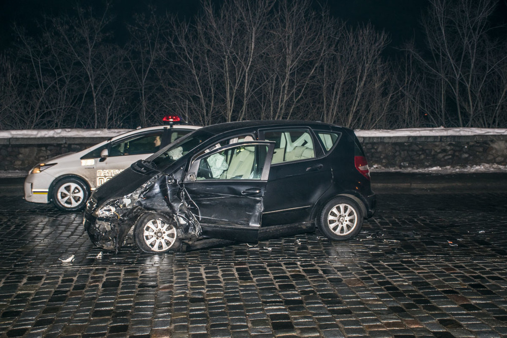 Авария случилась около 23:00. Со слов свидетелей, вверх по Владимирскому спуску на большой скорости поднимался серый Mercedes на еврономерах. Авто носило по всей дороге. Через мгновение они увидели, как машину понесло боком и он врезался в черный Mercedes, спускавшийся по Владимирскому спуску. Затем серый автомобиль начал крутиться на мокрой брусчатке и он водительской стороной влетел в Renault Kangoo.