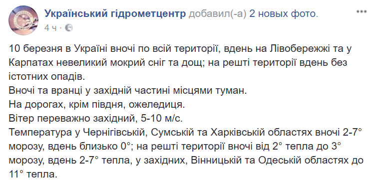 "10 марта в Украине ночью по всей территории, днем на Левобережье и в Карпатах небольшой мокрый снег и дождь; на остальной территории днем без существенных осадков. Ночью и утром в западной части местами туман", - говорится в сообщении.