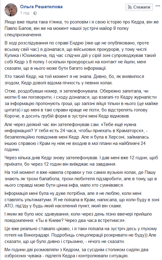 В ходе расследования по делу Эндрю (которое еще не опубликовано, однако всему свое время) я узнала, что военных прокуроров, в том числе Кулика и Ефимовича, во время следственных действий в серой зоне сопровождал некий Кедр из 8-го полка. И поскольку прокурорские на контакт не шли, мне сказали, что у него может быть много информации.