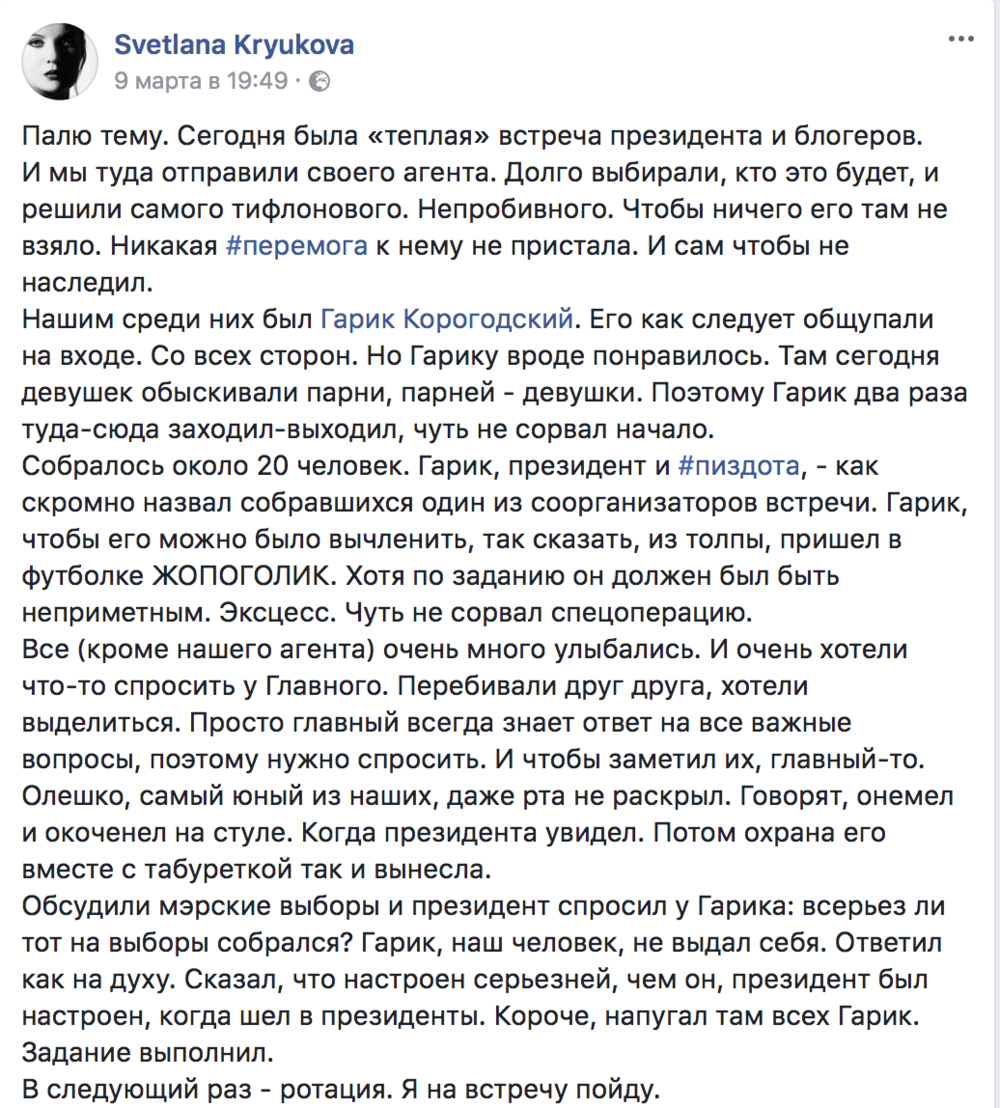 Сначала в шутку заместитель главного редактора "Страны" Светлана Крючкова написала, что на встрече был и Гарик Корогодский в качестве блогера.