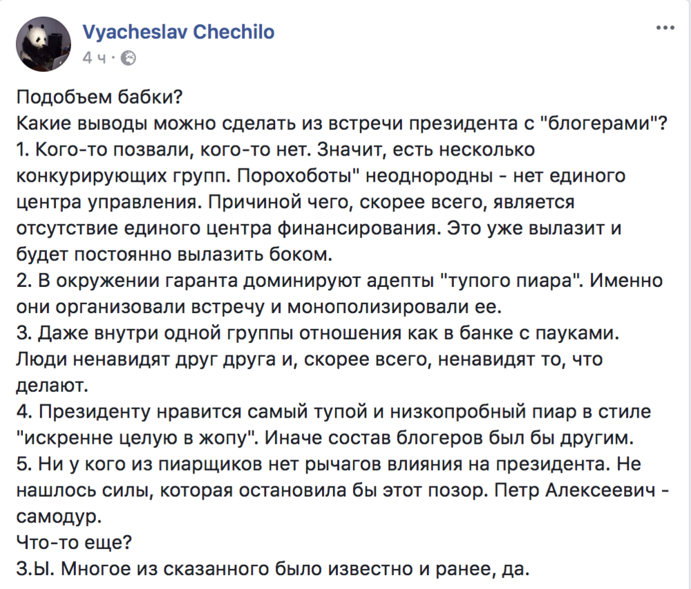 Журналист Вячеслав Чечило говорит, что прошедшая встреча свидетельствует о расколе внутри порохоботов и о полном неадекватности президента и его команды в плане информационной политики.