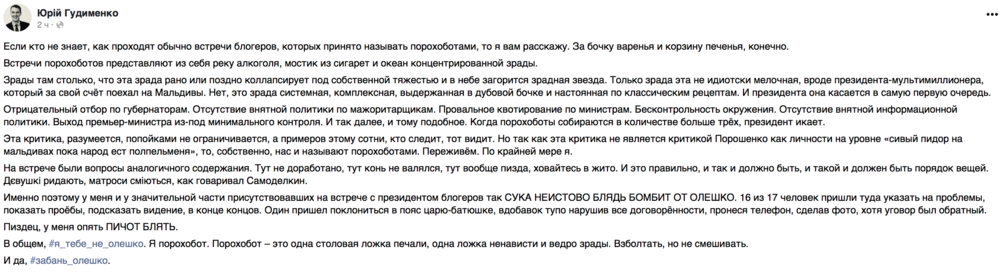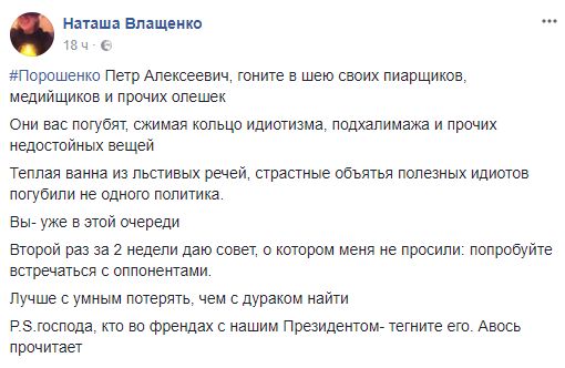 "Порошенко Петр Алексеевич, гоните в шею своих пиарщиков, медийщиков и прочих олешек. Они вас погубят, сжимая кольцо идиотизма, подхалимажа и прочих недостойных вещей. Теплая ванна из льстивых речей, страстные объятья полезных идиотов погубили не одного политика. Вы- уже в этой очереди.