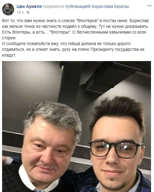 Волонтер и военный инструктор Цви Ариэли прокомментировал встречу и селфи порохобота Олешко с президентом: " Есть блоггеры, а есть...."блоггеры". С бесчисленными кавычками со всех сторон. И сообщите пожалуйста ему, что гейша должна не только дорого отдаваться, но и этикет знать: руку на плечо Президенту государства не кладут".