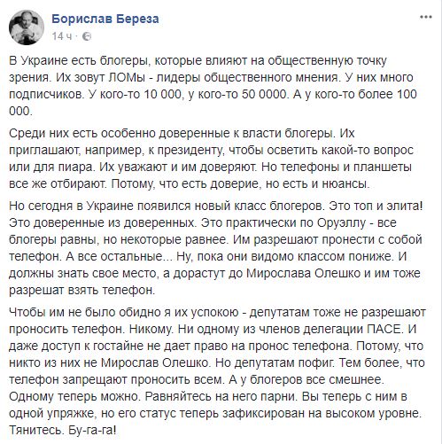 Депутат Борислав Береза тоже прошелся по Олешко: "В Украине есть блогеры, которые влияют на общественную точку зрения. Их зовут ЛОМы - лидеры общественного мнения. У них много подписчиков. У кого-то 10 000, у кого-то 50 0000. А у кого-то более 100 000.