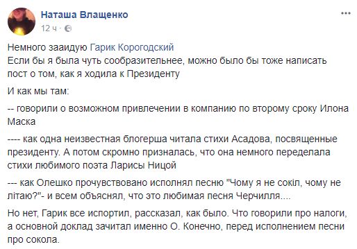 Продюсер и телеведущая Наталья Влащенко написала, что немного завидует Гарику Корогодскому:  "Если бы я была чуть сообразительнее, можно было бы тоже написать пост о том, как я ходила к президенту. И как мы там:
