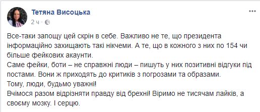 Об этом же пишет и журналист Татьяна Высоцкая, призывая думать, а не верить лайкам в интернете: "Важно не то, что президента информационно защищают такие ничтожества. А то, что у каждого из них по 154 или более фейковых аккаунтов.