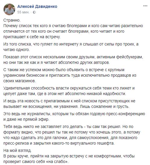 "Странно, почему список тех, кого я считаю блогерами и кого сам читаю разительно отличается от тех кого он считает блогерами, кого читает и кого приглашает к себе на встречу. Из того списка, что гуляет по интернету я слышал от силы про троих, а читаю одного. Показал этот список нескольким своим друзьям, активным фейсбукерам, но они так же, как и я, читают абсолютно других авторов.