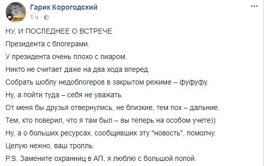 Также бизнесмен добавил: "У президента очень плохо с пиаром. Никто не считает даже на два хода вперед. Собрать шоблу недоблогеров в закрытом режиме – фуфуфу. Ну, а пойти туда – себя не уважать. От меня бы друзья отвернулись, не близкие, тем пох – дальние. Тем, кто поверил, что я там был – вы теперь на особом учете)) Ну, а о больших ресурсах, сообщивших эту "новость", помолчу". Целую нежно, ваш тролль".