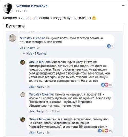 Скриншот их комментариев выложила журналист Светлана Крюкова с подписью: "Мощная вышла пиар акция в поддержку президента".