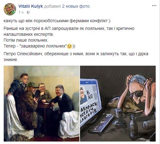 "Говорят, что между порохоботскими фермами конфликт. Ранее на встречи в АП приглашали как лояльных, так и критически настроенных экспертов. Затем только лояльных. Теперь - "зашкварено лояльных". Петр Алексеевич, осторожнее с ними, они же залижут так, что и дырка исчезнет".