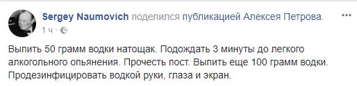 Блогер Сергей Наумович поделился постом одного из порохоботов с дифирамбами президенту и снабдил его инструкцией о том, как надо читать: "Выпить 50 грамм водки натощак. Подождать 3 минуты до легкого алкогольного опьянения. Прочесть пост. Выпить еще 100 грамм водки. Продезинфицировать водкой руки, глаза и экран".