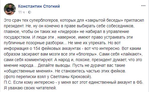 "Это срач тех суперблогеров, которых для "закрытой беседы" пригласил президент. Не, ну он конечно в праве выбирать себе собеседников, главное, чтобы он таких же "лидеров" не набирал в управление государством. И люди эти, наверное, имеют право устраивать эти публичные позорные разборки... Не мне их упрекать.