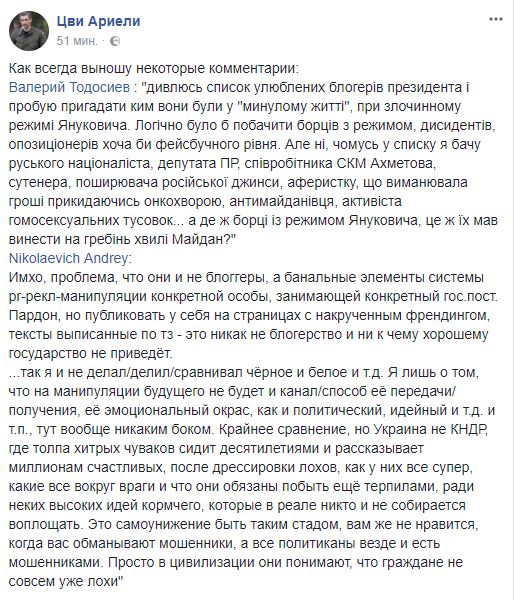 "Валерий Тодосиев : "Смотрю список любимых блоггеров президента и пытаюсь вспомнить кем они были в "прошлой жизни", при преступном режиме Януковича. Логично было бы увидеть борцов с режимом, диссидентов, оппозиционеров хотя бы фейсбучного уровня. Но нет, почему-то в списке я вижу русского националиста, депутата ПР, сотрудника СКМ Ахметова, сутенера, распространителя российской джинсы, аферистку, что выманивала деньги притворяясь онкобольной, антимайдановца, активиста гомосексуальных тусовок ... а где же борцы с режимом Януковича, это же их должен был вынести на гребень волны Майдан?"