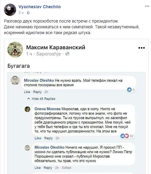Хитом сходки стал пропрезидентский блогер Мирослав Олешко. На него обрушились не только традиционные хейтеры и оппоненты, но и соратники по порохоботскому лагерю.