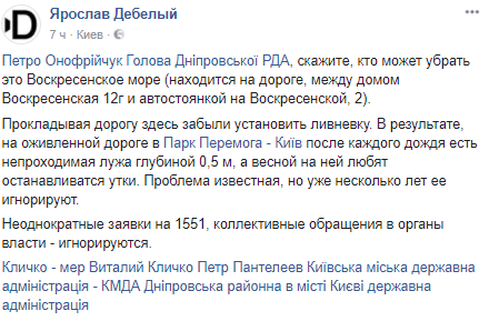 "Прокладывая дорогу, здесь забыли установить ливневку. В результате на оживленной дороге в парк "Победа" после каждого дождя есть непроходимая лужа глубиной 0,5 метра, а весной на ней любят останавливаться утки. Проблема известная, но уже несколько лет ее игнорируют", - написал Ярослав.