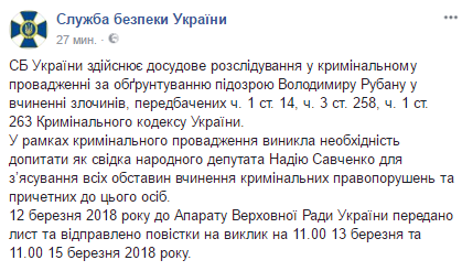 В спецслужбе напомнили, что осуществляют досудебное расследование в уголовном производстве по обоснованному подозрению руководителю Центра освобождения пленных "Офицерский корпус" Владимиру Рубану в совершении преступлений по ч.1 ст.14, ч.3 ст.258 (подготовка террористического акта), ч.1 ст.263 (ношение, хранение, приобретение, изготовление, ремонт, передача или сбыт огнестрельного оружия, боевых припасов, взрывчатых веществ или взрывных устройств без предусмотренного законом разрешения) Уголовного кодекса Украины. В рамках этого производства возникла необходимость допросить в качестве свидетеля Савченко "для выяснения всех обстоятельств совершения уголовных правонарушений и причастных для этого лиц".