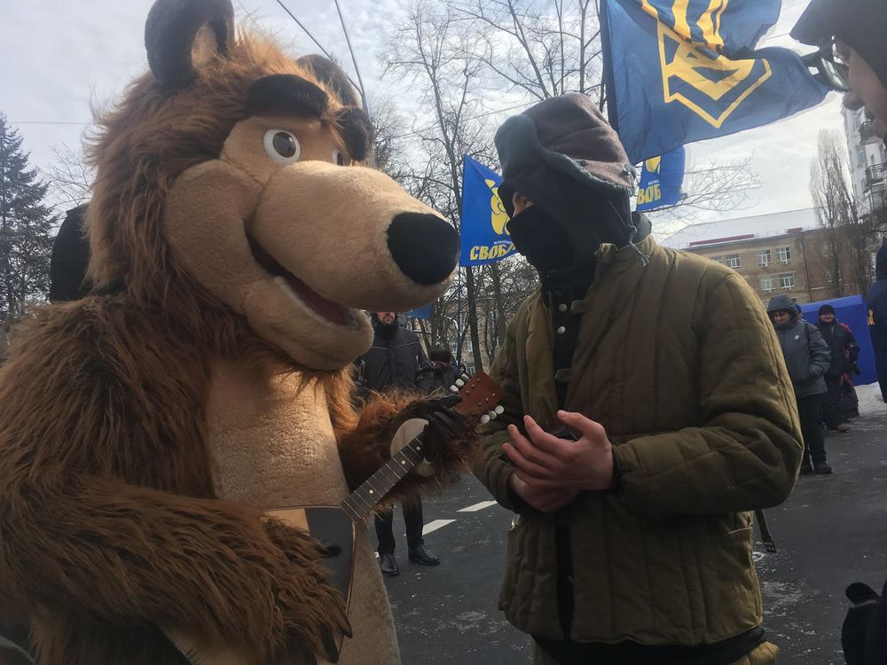 11:01  Под российским посольством в Киеве прямо настоящая "реконструкция". "Ватник" и ряженый медведь одевают "золотого Путина".