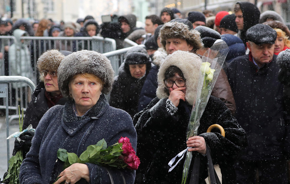 Люди приносили цветы к зданию театра в Камергерском переулке задолго до официального начала церемонии прощания.