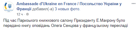 "Во время Парижского книжного салона Президенту Э. Макрону была передана книга рассказов Олега Сенцова во французском переводе", - говорится в сообщении посольства.