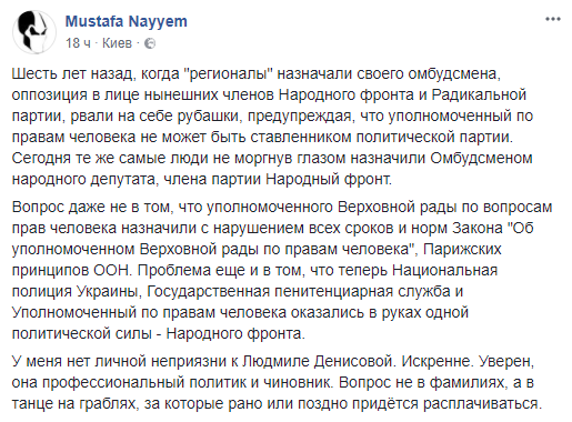 "С нарушением ряда писаных и неписаных норм и правил, отечественных и международных, сегодня был избран новый омбудсвумен Украины. Политические торги – это, конечно, не украинское изобретение, но даже в не вполне правовых и демократических странах есть красные линии, которые никогда не переходят. Одна из них – должностное лицо, которое должно защищать права человека, должно быть представителем интересов обездоленных и затравленных репрессивной правоохранительной машиной. Это должностное лицо по определению не может быть частью политических торгов – а тем более избираться с прямым нарушением духа и буквы профильного закона, Парижских принципов и ряда других международных договоренностей по институту национального Уполномоченного по правам человека.