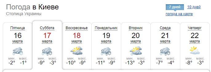 Сайт "Синоптик" предсказывает 3-9 градусов мороза, снег, пасмурную погоду в субботу и переменную облачность в воскресенье.