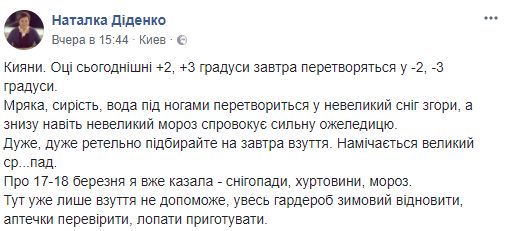 Синоптик Наталья Диденко в своем Facebook предупредила, что будет очень скользко и холодно – да так, что придется доставать зимний гардероб.