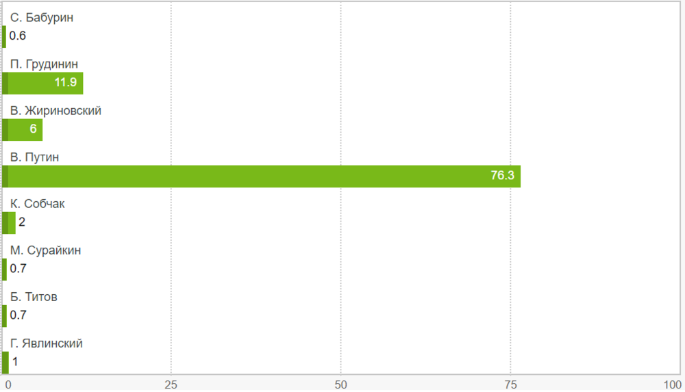По результатам экзитпола ВЦИОМ, президентом Российской Федерации в первом туре избран Владимир Путин (73,9% голосов).