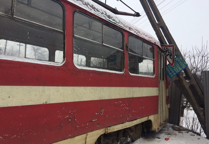 В Запорожье трамвай сошел с рельсов и протаранил забор
