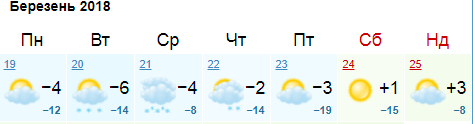 Сайт Weather.com сообщает, что до среды днем будет держаться минусовая температура -1...-3. С четверга днем ожидается плюсовая температура +1...+4. Снег возможен 20 и 21 марта.