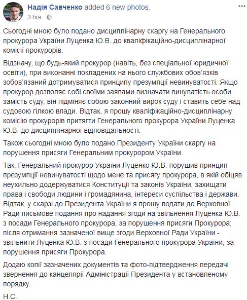 "В жалобе к Президенту Украины я прошу подать в Верховную Раду письменное представление о предоставлении согласия на увольнение Луценко Ю.В. с должности генерального прокурора, за нарушение присяги Прокурора; после получения указанного выше согласия Верховной Рады Украины - освободить Луценко Ю.В. от должности генерального прокурора Украины за нарушение присяги прокурора", - написала Савченко.