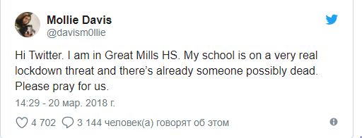 Ученица школы Молли Дэвис написала в Twitter: "Моя школа находится в очень серьезной опасности, и уже есть кто-то, возможно, мертвый. Пожалуйста, молитесь за нас".