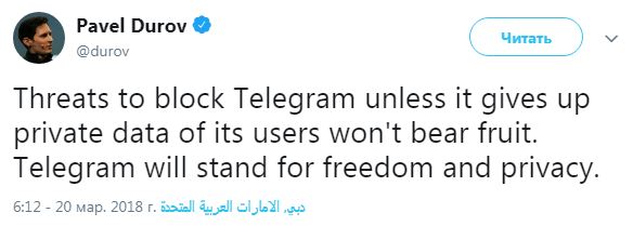 "Угрозы заблокировать Telegram, если не будут выданы частные данные его пользователей, не принесут плодов. Telegram будет отстаивать свободу и неприкосновенность частной жизни", - написал Дуров на своей странице в Twitter.