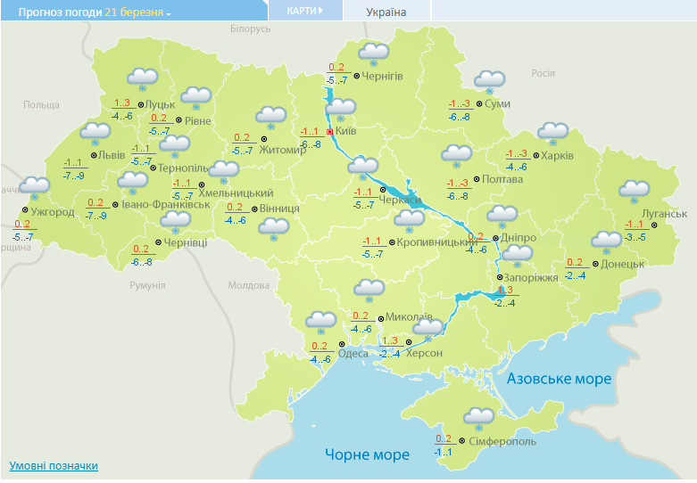 В Киеве 21 марта снег. Дневная температура -1...+1.