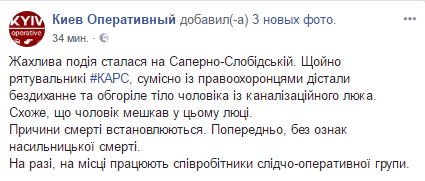 "Только что спасатели КАРС, совместно с правоохранителями получили бездыханное и обгоревшее тело мужчины из канализационного люка. Похоже, что человек жил в этом люке. Причины смерти устанавливаются. Предварительно, без признаков насильственной смерти. На данный момент, на месте работают сотрудники следственно-оперативной группы," - говориться в сообщении.