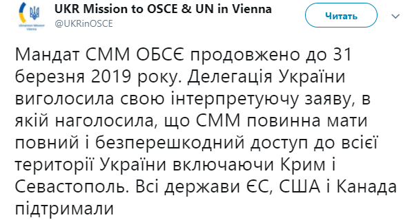 "Мандат СММ ОБСЕ продлен до 31 марта 2019 года. Делегация Украины объявила свое интерпретирующее заявление, в котором отметила, что СММ должна иметь полный и беспрепятственный доступ ко всей территории Украины включая Крым и Севастополь. Все государства ЕС, США и Канада поддержали", - говорится в сообщении.