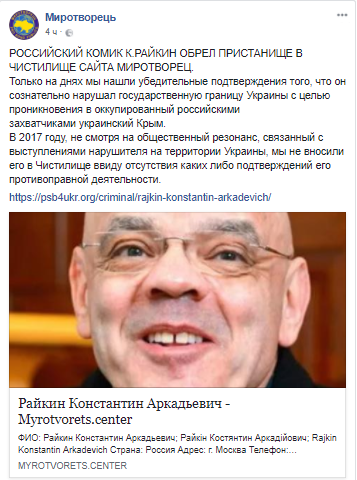 Также в сообщении говорится, что убедительные доказательства посещения Райкиным Крыма были найдены лишь недавно, хотя подозревался он в этом с 2014 года.