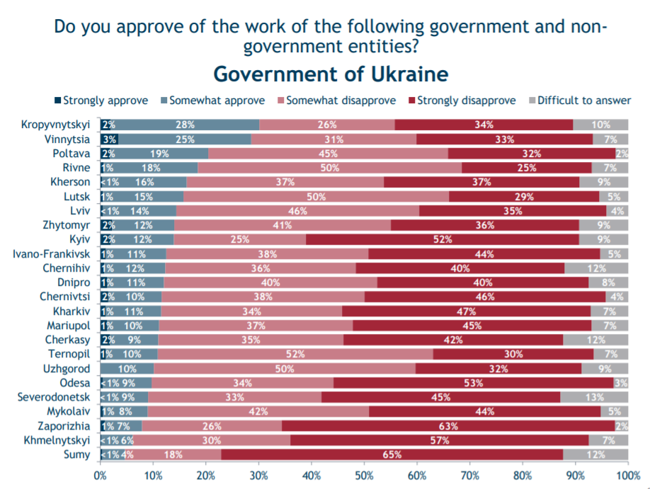 Самые оптимистичные города – это Львов, Винница и Кропивницкий, где видят перспективу 24% опрошенных. Меньше всего оптимистов – в Херсоне, Северодонецке и Мариуполе (по 10%), Одессе (9%) и Николаеве (8%).