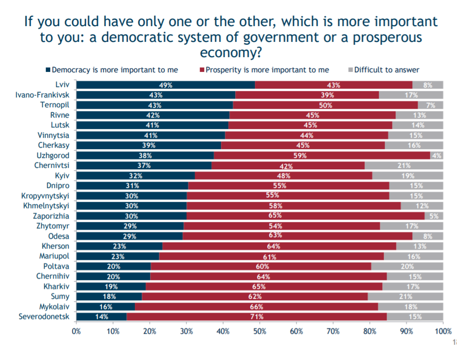 Судя по ответам украинцев – не готовы. В большинстве областных центров сторонники "процветания без демократии" перевешивают "демократов". Исключения составляют Львов и Ивано-Франковск.