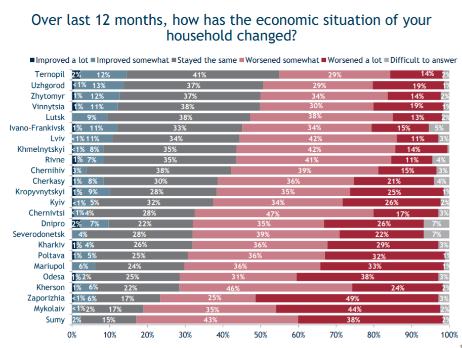 Впрочем, и здесь картина зеркальная – доля ответов "состояние ухудшилось" оказалась самой большой. Хуже всего дела обстоят в Запорожье (74% заявили об ухудшении), Николаеве (79%) и Сумах (81%).