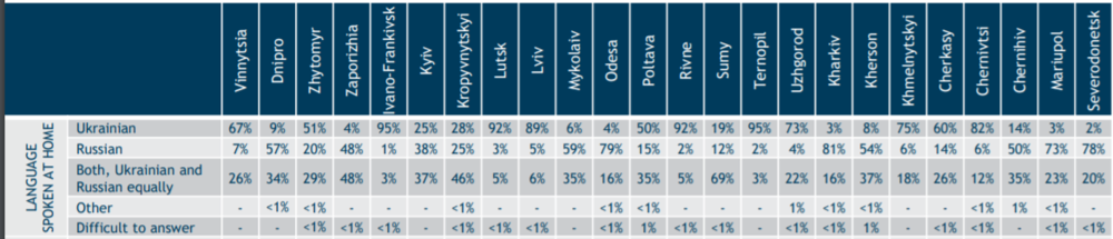 Последний доминирует в западных и центральных областях страны. Исключением для запада является Закарпатье. В Ужгороде русский так или иначе используют 26% респондентов.