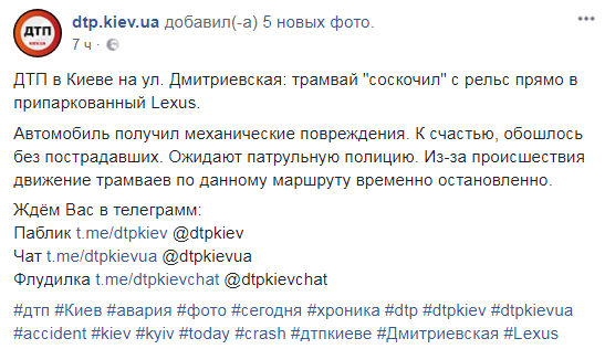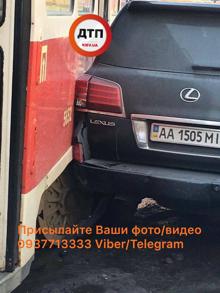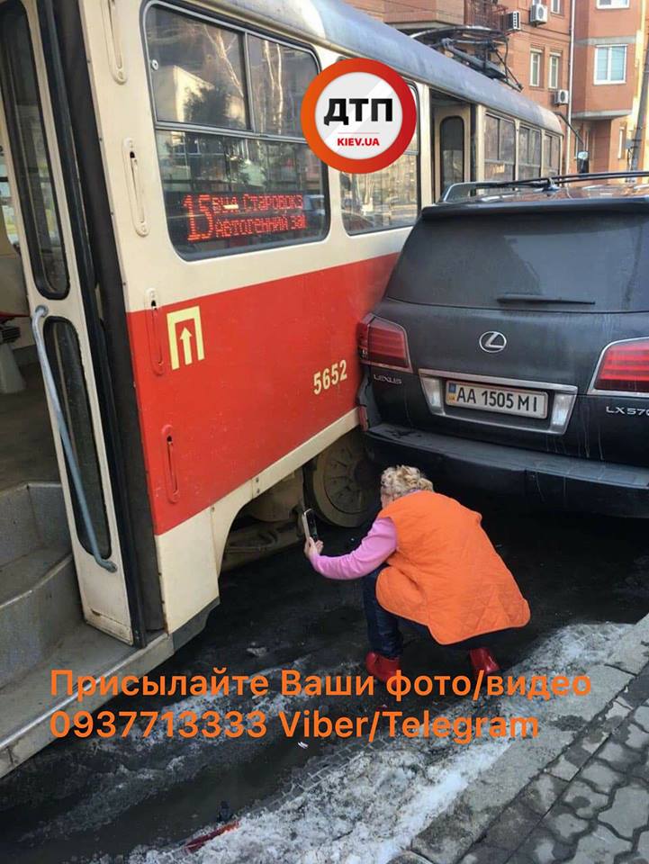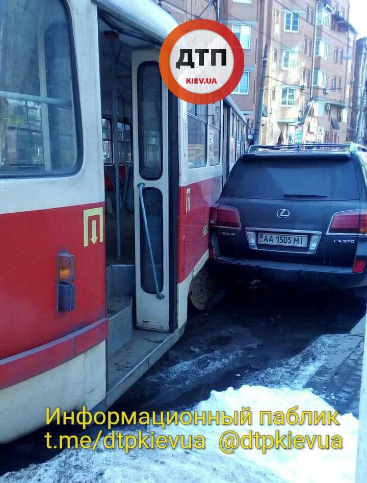 В воскресенье, 25 марта на ул. Дмитриевская в Киеве трамвай слетел с рельс и врезался в припаркованный Lexus.