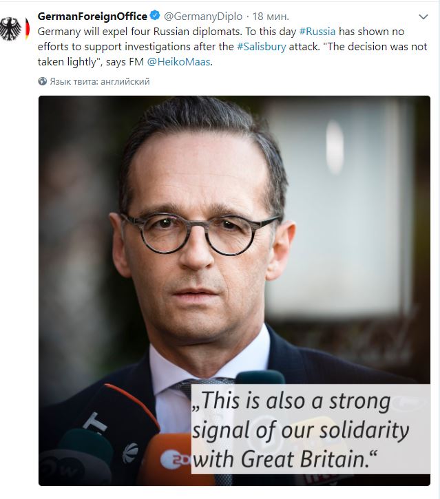 Власти ФРГ приняли решение о высылке четырех российских дипломатов и-за инцидента с отравлением экс-полковника ГРУ Сергея Скрипаля. Об этом заявил глава МИД ФРГ Хайко Маас, сообщает Twitter внешнеполитического ведомства.