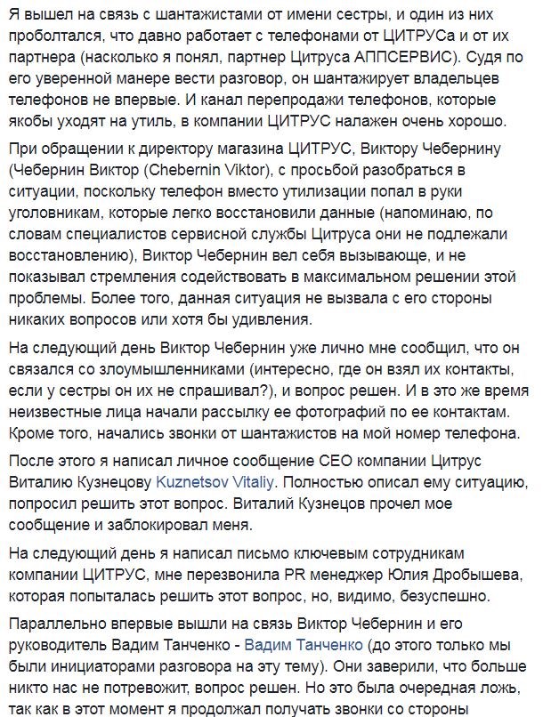 "Цитрус" настаивает, что имел место частный случай – нерадивый работник продал смартфон шантажистам, оформив его сначала как непригодный. Правда, пока нет никакой информации о возбуждении уголовного дела против этого работника как возможного соучастника схемы вымогательства. Ведь он мог успеть провернуть множество таких дел.