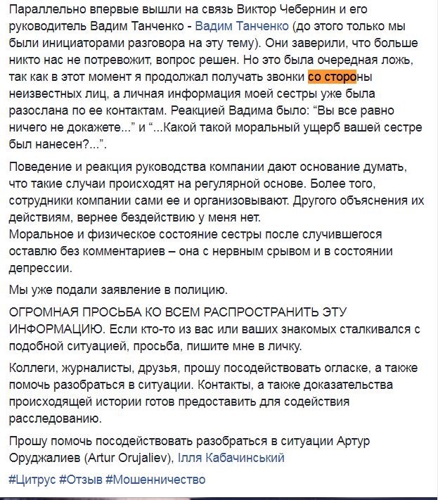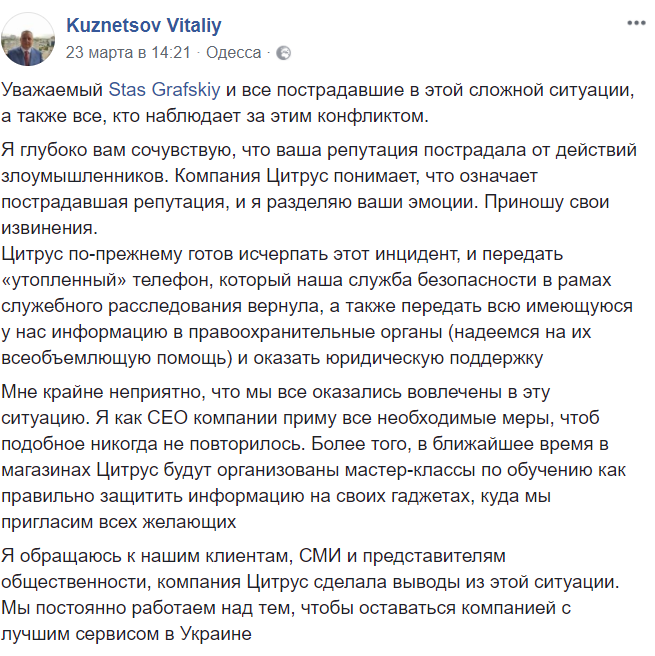 "Цитрус по-прежнему готов исчерпать этот инцидент и передать "утопленный" телефон, который наша служба безопасности в рамках служебного расследования вернула, а также передать всю имеющуюся у нас информацию в правоохранительные органы (надеемся на их всеобъемлющую помощь) и оказать юридическую поддержку", – написал он в Facebook.