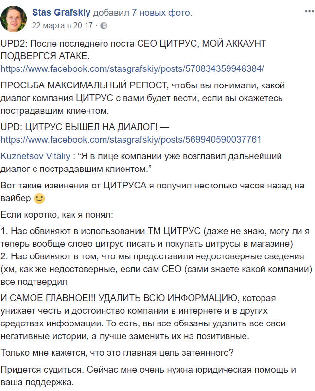 Кроме того, киевлянин сообщил, что его первоначальное сообщение, с которого все началось, было удалено с Facebook – вместе с тремя тысячами репостов, которые больно били по репутации компании.