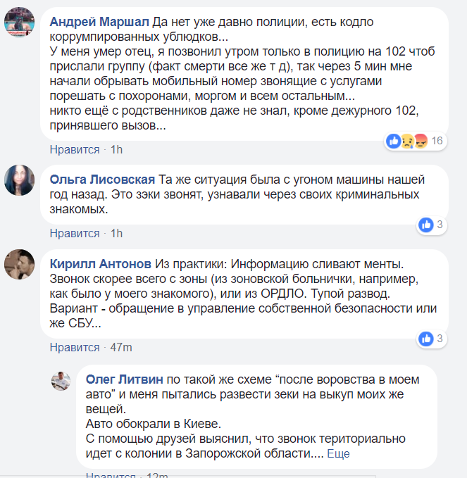 Андрей Маршал: "У меня умер отец, я позвонил утром только в полицию на 102 чтоб прислали группу (факт смерти все же т д), так через 5 мин мне начали обрывать мобильный номер звонящие с услугами порешать с похоронами, моргом и всем остальным... никто еще из родственников даже не знал, кроме дежурного 102, принявшего вызов".