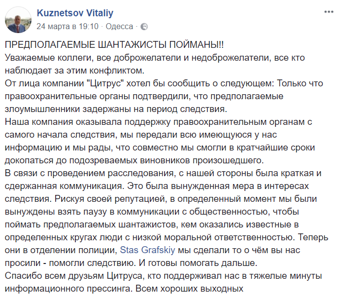 Через четыре дня после жалобы и поднявшегося ажиотажа в СМИ на претензию ответил владелец "Цитруса" Виталий Кузнецов. Он частично признал вину своей компании и извинился перед Графским и его сестрой. А также пообещал содействовать расследованию полиции, если она его начнет.
