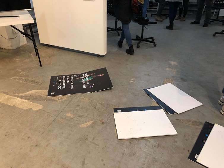 Один из парней прошелся ногами по плакату с людьми с инвалидностью. Люди остались в помещении, сказали, что "хотят участвовать в дискуссии".